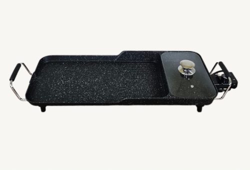 Eisenbach EB-9028: Szeroki, wielofunkcyjny grill elektryczny i stół do gorących garnków 3 w 1 to wszechstronne i przestronne urządzenie do gotowania, zaprojektowane z myślą o obsłudze różnych metod gotowania w jednym wygodnym urządzeniu. Ma wymiary 65 cm na 26 cm i jest wyposażony w duży grill i zestaw do gorącego garnka, idealny na spotkania rodzinne lub zabawę dla gości. Powierzchnia grillowania jest podzielona na żebrowany grill o wymiarach 16 cm x 26 cm do tradycyjnego grillowania, część garnkową o wymiarach 16 cm x 26 cm do zup i bulionów oraz duży płaski grill o wymiarach 32 cm x 26 cm, idealny do gotowania warzyw, jajek, naleśników lub delikatnych potraw, które wymagają gładką powierzchnię.