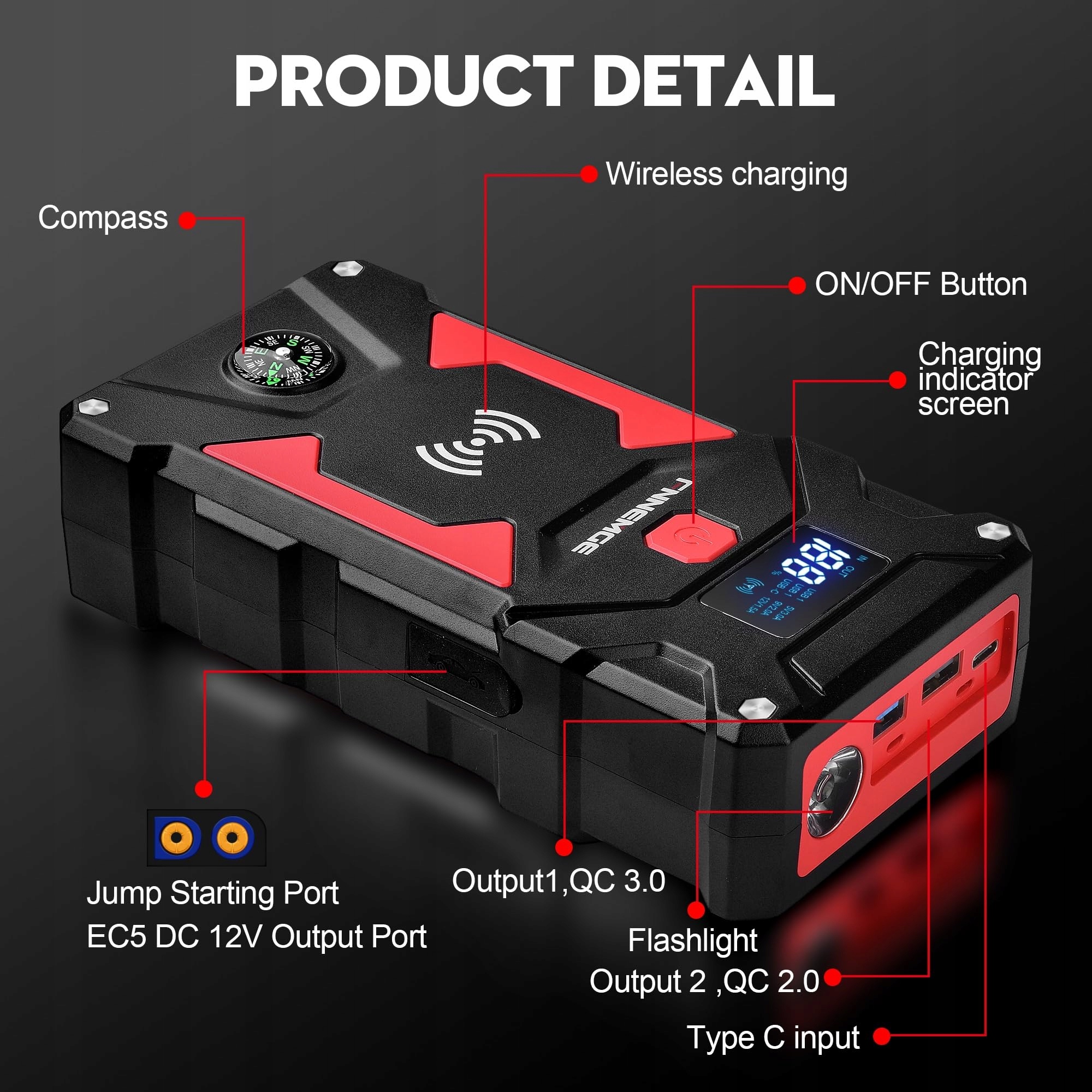 FNNEMGE Starthilfe Powerbank 5000A 24800mAh (Wszystkie benzynowe i do 8,0L diesla) Ulepszony booster akumulatorowy, z 10W bezprzewodowym ładowaniem powerbank. oraz inteligentny kabel do rozruchu.