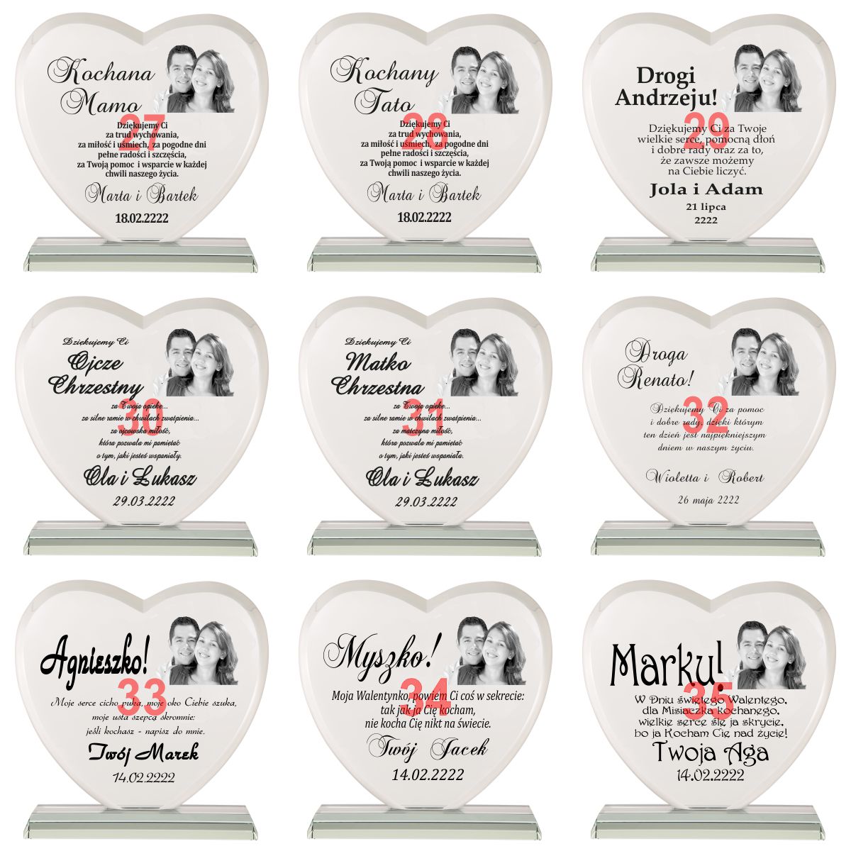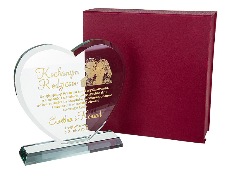 Masz problem z podjęciem decyzji jaki prezent wybrać na podziękowania dla rodziców? Idziesz na rodzinną imprezę i nie wiesz co kupić jubilatowi / solenizantowi? Kup tą statuetkę! Jest to szklana statuetka z pięknym etui. Ma szlifowane boki i kanty aby prezentować się jeszcze piękniej. Szkło ma grubość aż 19 mm. Ponadto jest grawerowana na wysokiej jakości ploterze laserowym, a grawer jest ręcznie i bardzo dokładnie wypełniany przez rzemieślnika specjalną farbą. Złocenie / srebrzenie mieni się pod światło i daje niesamowity efekt. Wszystko dopełnia piękne bordowe etui z bordową satyną w którym statuetka prezentuje się jeszcze piękniej, a złocenie uwydatnia się.
