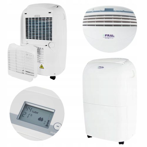 Osuszacz FRAL Dry Digit 21LCD jest wyposażony w nowoczesny wyświetlacz LCD, który dostarcza natychmiastowych informacji o poziomie wilgotności i temperaturze, co pozwala na szybką i łatwą kontrolę nad środowiskiem. Elektroniczny higrostat zintegrowany z panelem sterującym umożliwia użytkownikowi precyzyjne ustawienie pożądanego poziomu wilgotności, co jest niezbędne dla zapewnienia optymalnych warunków w pomieszczeniu.