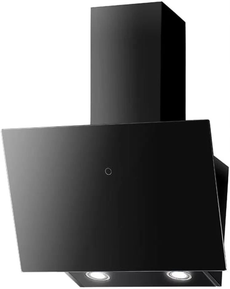 Nowoczesny okap przyścienny, ukośny o minimalistycznym designie i wykończeniu z czarnego szkła.