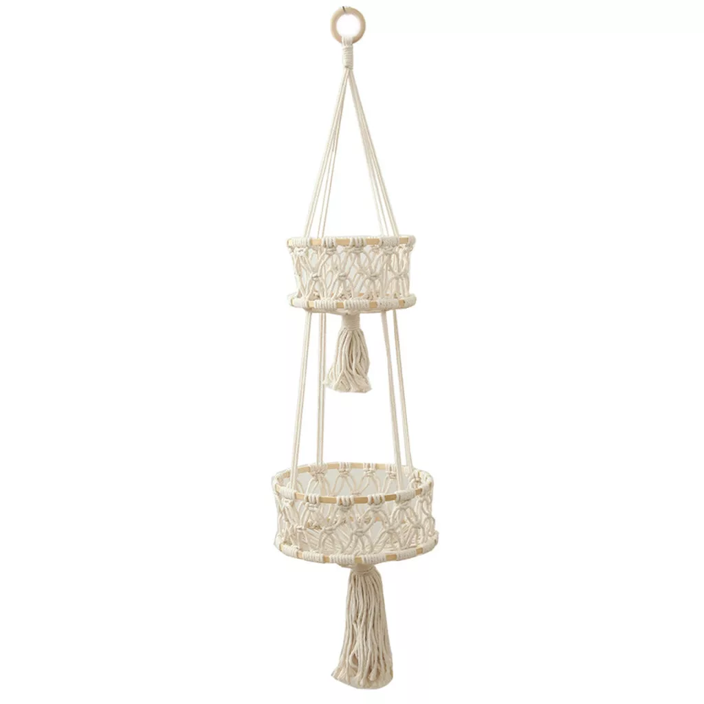 Wiszący kosz makramowy do przechowywania roślin w domu, owoców i warzyw, biały, 2 poziomy