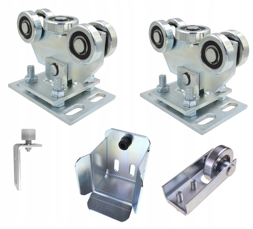 Wózek jezdny (dwie sztuki) z 5 rolkami wykonanymi z metalu (w tym z jedną rolką poziomą). Wózek jest wahliwy i dopasowuje się do bramy przesuwnej (jest połączony z podstawą za pomocą trzpienia). Posiada również regulację wysokości za pomocą śrub. Jest przeznaczony do szyny 70x70x4 mm. Produkt ocynkowany.
