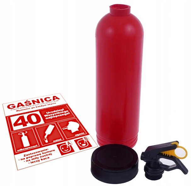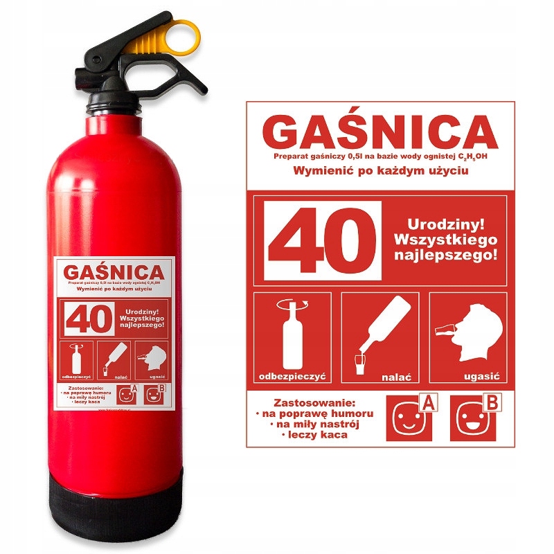 Karnet z recepto in gasilni aparat - 40. rojstni dan za moškega gasilca je edinstven in zabaven način, da presenetite obdarovanca. Izdelan je iz visokokakovostnega debelega papirja s 350g gramaturo in s sijajnim lakiranjem UV. V notranjosti karneta je posebna recepta, ki jo gostje lahko izpolnijo, navdihnjena z originalnim tiskom. Originalna in zabavna besedila bodo presenetila vsakega slavljenca in zagotovo mu pričarala nasmeh na obrazu. Karnet je lahko odličen dodatek k vsakemu darilu in vsebuje tudi humoristične želje. Dimenzije sestavljenega karneta so 20,5×13 cm, gramatura papirja je 350g, lakirano z UV lakom. V kompletu je tudi kuverta. Plastična atrapa gasilca je idealna skrinja za alkohol, saj ima etiketo z navodili za uporabo in sprejme steklenico 0,5 L. Denko atrape je vijak in se odvija. Atrapa ima zavore, ki so premični z izvlečno zamaškom. Zunanje dimenzije so višina 36 cm, premer 8,5 cm, notranje dimenzije pa višina 27,5 cm, premer 8 cm. Ta unikaten izdelek je popolno dar