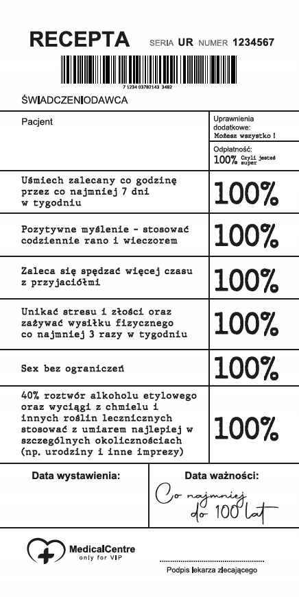 Wewnątrz karnetu znajduje się dedykowana recepta wzorowana na oryginalnym druku, którą wypełniają goście. Oryginalne i wesołe teksty zaskoczą każdego jubilata i z pewnością wywołają uśmiech na jego twarzy. Karnet może być idealnym dodatkiem do każdego prezentu. Karnet zawiera również humorystyczne życzenia.
