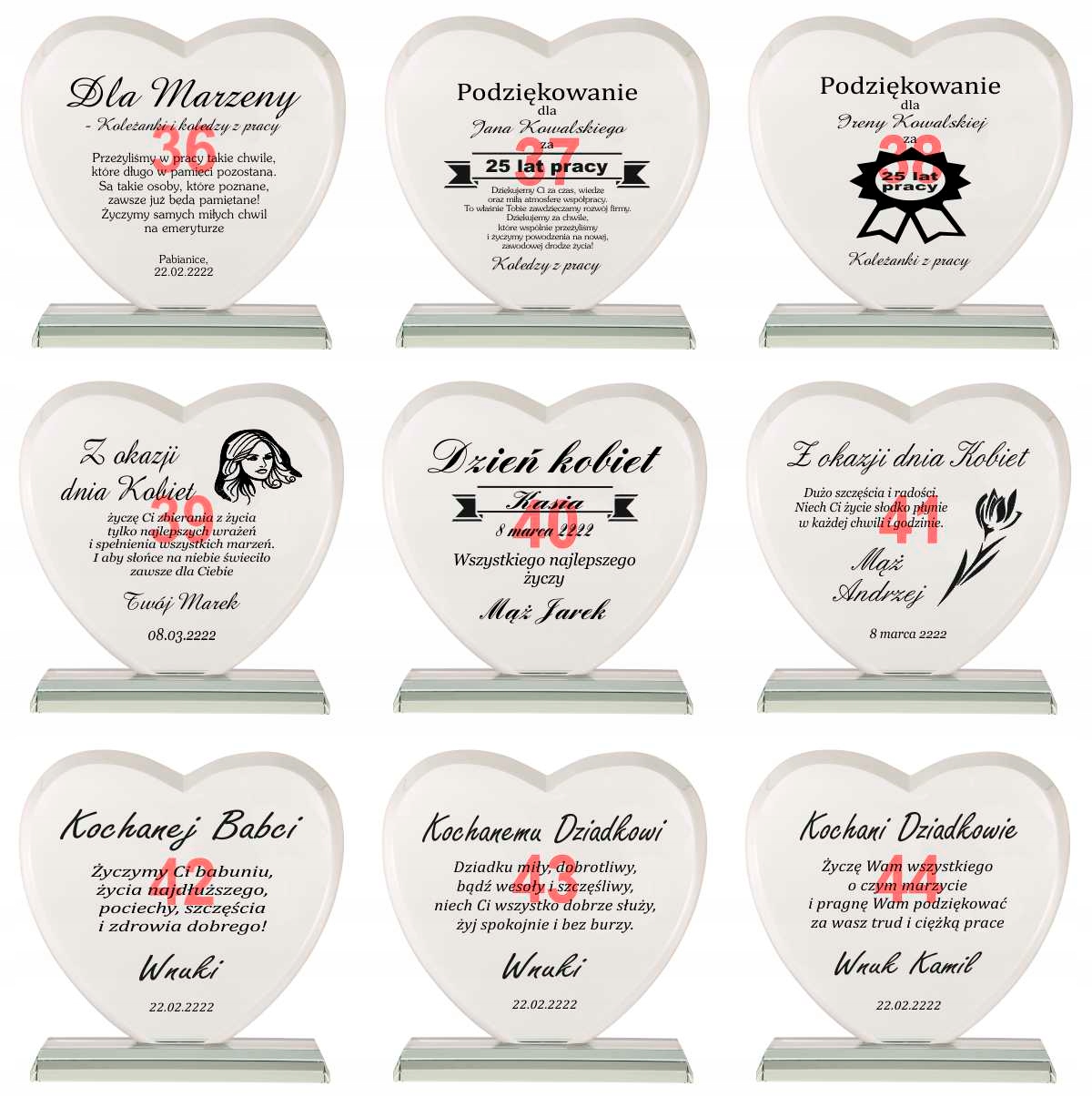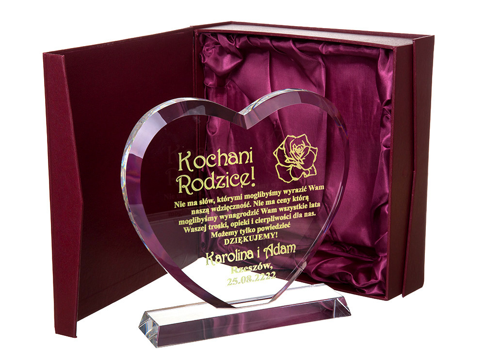 Masz problem z podjęciem decyzji jaki prezent wybrać na podziękowania dla rodziców? Idziesz na rodzinną imprezę i nie wiesz co kupić jubilatowi / solenizantowi? Kup ten produkt! Jest to kryształowa statuetka w kształcie serca z pięknym bordowym etui. Ma szlifowane boki i kanty aby prezentować się jeszcze piękniej. Kryształ ma grubość aż 19 mm! Ponadto jest grawerowany na wysokiej jakości ploterze laserowym, a grawer jest ręcznie i bardzo dokładnie wypełniany przez rzemieślnika specjalną farbą. Złocenie / srebrzenie mieni się pod światło i daje niesamowity efekt. Wszystko dopełnia piękne bordowe etui z bordową satyną w którym statuetka prezentuje się jeszcze piękniej, a złocenie uwydatnia się.