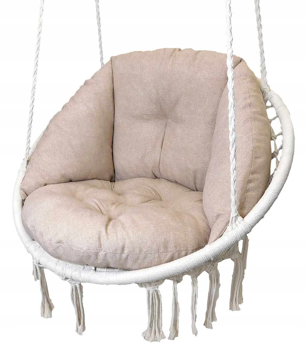 ✅ Poduszka składa się z dwóch elementów integralnie ze sobą połączonych (oparcia z bocznymi skrzydłami oraz siedziska w kształcie koła o średnicy 60 cm), zszytych w spójną całość. Dzięki temu poduszka idealnie wypełnia wnętrze huśtawki i sprawia, że wypoczynek na niej to prawdziwa przyjemność.