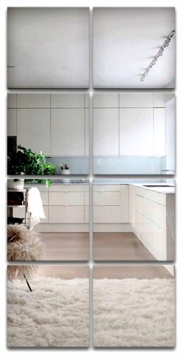 Przy zakupie kilku kompletów Płytek Lustrzanych możliwość ułożenia swojego niepowtarzalnego wzoru na ścianie. Tak naprawdę ogranicza nas tylko i wyłącznie nasza wyobraźnia. Dzięki temu że Płytki Lustrzane nie są zamknięte w ramie, wzór który ułożymy na ścianie odmieni nasze pomieszczenia w oryginalny sposób.
