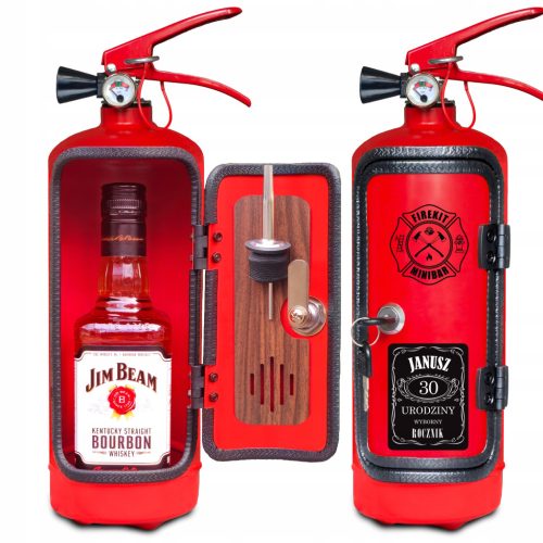 Nasz barek wykonany z nowej gaśnicy i zamykany na klucz. Produkt odznacza się nie tylko doskonałym wyglądem, ale również funkcjonalnością. W środku można zmieścić butelkę o wysokości do 24cm i szerokości do 8cm. Naprzykład Jim Beam, Jack Daniels 500 ml.