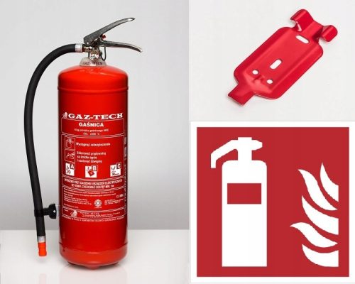 Do gaśnicy dodajemy metalowy wieszak zaczepowy do zamontowania gaśnicy na ścianie lub w samochodzie, z którego w bardzo łatwy i szybki sposób można ją zdjąć i udać się w miejsce pożaru oraz oznakowanie ,,GAŚNICA" na płycie sztywnej wymiary (15x15 cm.)
