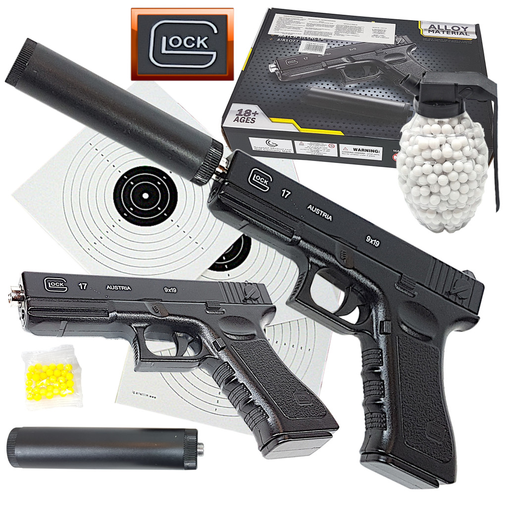 Metalowy Pistolet Na Kulki GLOCK 17 100% METAL+ dwie tarcze, replika w skali 1:1 z podobną wagą jak autentyczna broń ręczna.