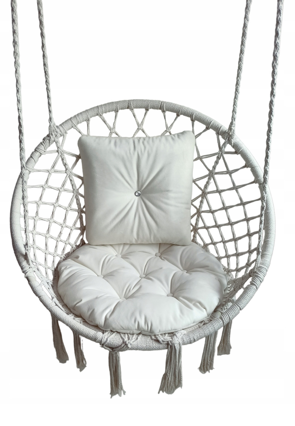 Wykonane z materiału welur/plusz. Bardzo miłe i przyjemne w dotyku. Wymiar poduszki siedzisko to 65cm średnicy a na oparcie poduszka o wymiarze 40x40cm. Wypełnione owatą co sprawia że są miękkie i wygodne.