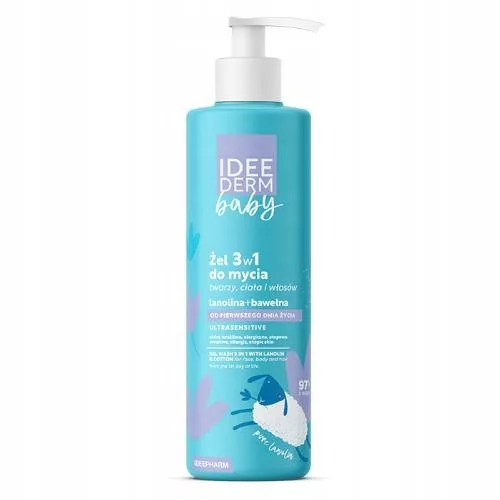 Idee Derm Baby Żel 3w1 do mycia twarzy, ciała i włosów to delikatny żel o przyjaznym dla skóry pH na bazie naturalnie nawilżającej, hipoalergicznej lanoliny, przeznaczony do mycia i codziennej pielęgnacji ciała i włosów dzieci oraz niemowląt od 1. dnia życia.