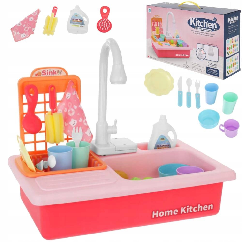 Umywalka wyposażona została w niezwykle realistyczny kran, z którego po włączeniu i wcześniejszym napełnieniu zbiornika zacznie płynąć woda. Twój maluch poczuje się jakby naprawdę mył naczynia i przygotowywał własne wyśmienite dania, lub sprzątał po uroczystej kolacji.