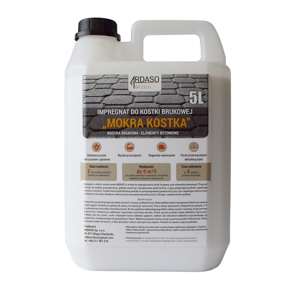 Impregnat MOKRA KOSTKA, to środek do zabezpieczania kostki brukowej oraz elementów betonowych przed niszczącym działaniem wody oraz warunków atmosferycznych.