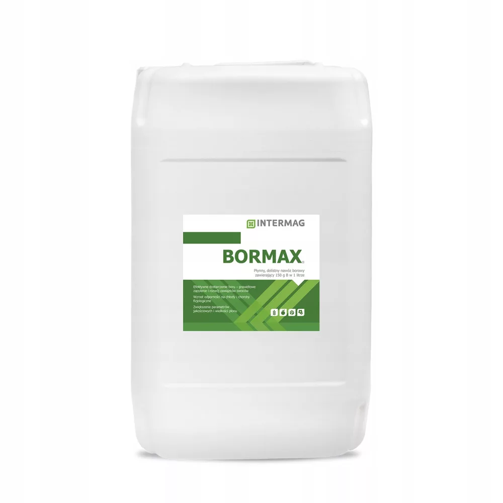 BORMAX® to płynny nawóz dolistny zawierający 150 g boru (B) w 1 litrze w formie boroetanoloaminy.