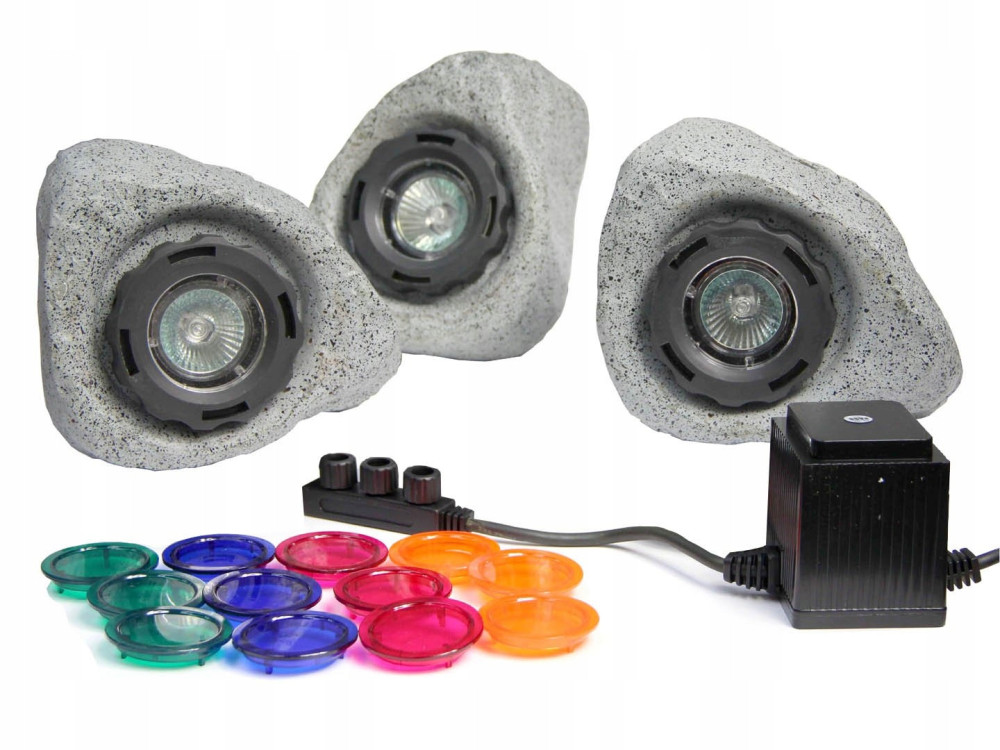 Oświetlenie CQD-202C to wysokiej jakości halogenowe lampy do zbiorników wodnych i ogrodu wbudowane w elegancka obudowę z kamienia. Hermetyczna obudowa sprawia, że mogą być one stosowane pod wodą w oczkach wodnych, stawach czy basenach, do podświetlania fontann, strumieni wody, itp, jak również jako oświetlenie ogrodowe, do oświetlania elewacji budynków i innych elementów architektonicznych. W zestawie znajdują się filtry, umożliwiające zmianę kolorów światła, ale zalecane jest ich używanie wyłącznie pod wodą.