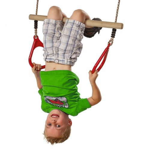 Trapez gimnastyczny na plac zabaw dla dzieci do wykorzystania na wiele sposobów który znakomicie rozwinie sprawność fizyczną Twojego dziecka. Ten super gadżet z pewnością zachęci każde dziecko do zabawy na świeżym powietrzu. Dziecko może huśtać się tradycyjnie wisząc na nim na rękach, nogach lub używać go jako przyrządu do podciągania się. Przeznaczony jest zarówno do użytku zewnętrznego jak i wewnątrz pomieszczeń. Trójkątne obręcze gimnastyczne wykonane z polipropylenu formowanego wtryskowo są bezpieczne dla małych rączek. Drewniany drążek zabezpieczony jest drewnochronem na bazie miedzi. Regulowane liny pozwolą zamontować ci go na wybranej przez ciebie wysokości. Trapez jest odporny na warunki atmosferyczne - nie odbarwia się pod wpływem słońca, charakteryzuje się dużą wytrzymałością - wytrzymuje ciężar wielokrotnie większy niż ciężar dziecka oraz jest bardzo łatwy w montażu. To wspaniały sposób bezpiecznej zabawy połączonej z aktywnością fizyczną. Szerokie zastosowanie w różnego rodzaju konstrukcjach lub zestawach zabawowych niewielkim kosztem zwiększy ich możliwości i funkcjonalność oraz pozwoli je dodatkowo uatrakcyjnić w oczach dziecka. Może być stosowany również oddzielnie.
