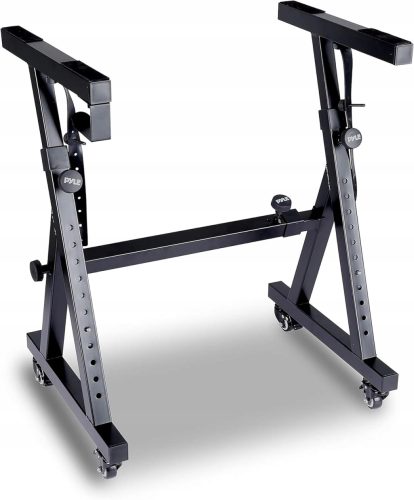 Kółka z blokadą: Stojak na klawiaturę w kształcie litery Z jest wyposażony w obrotowe kółka, które umożliwiają łatwe przemieszczanie go po scenie. Posiada także bezpieczny mechanizm blokujący, który pozwala na pewne zakotwiczenie stojaka, zapobiegając jego przesuwaniu się podczas gry.