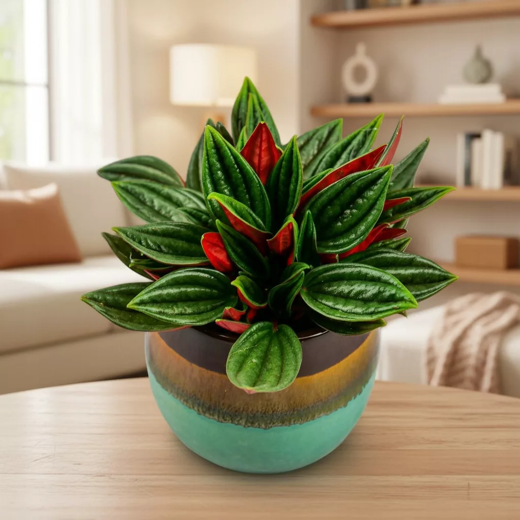 Peperomia Caperata ‘Rosso’ to kompaktowa, dekoracyjna roślina o mocno kędzierzawych, ciemnozielonych liściach z intensywnie czerwonym spodem. Tworzy gęstą, efektowną kępkę, która pięknie prezentuje się w małych osłonkach. Jej wyjątkowe wybarwienie i struktura liści sprawiają, że jest jedną z najbardziej ozdobnych peperomii.