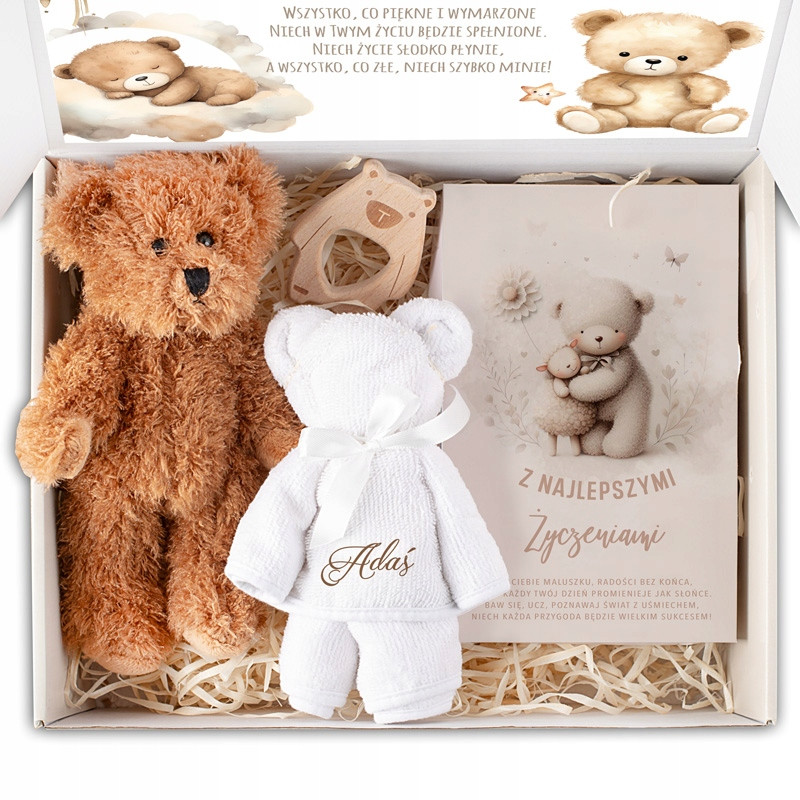 W eleganckim pudełku z personalizowaną wklejką znajdują się wyjątkowe upominki, które będą towarzyszyć dziecku przez wiele lat.