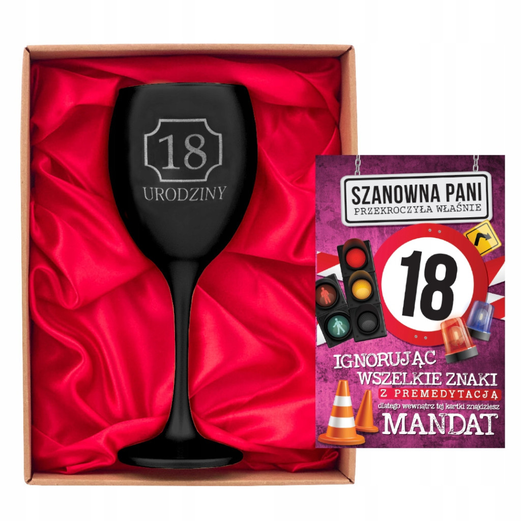 Elegancki kieliszek do wina w kolorze czarnym, udekorowany delikatnym grawerem „18 Urodziny”. Doskonały prezent na wyjątkową okazję. Zapakowany w kartonowe pudełko z wizjerem, wypełnione satyną w kolorze czerwonym. Idealny sposób na celebrowanie tego wyjątkowego momentu w życiu.