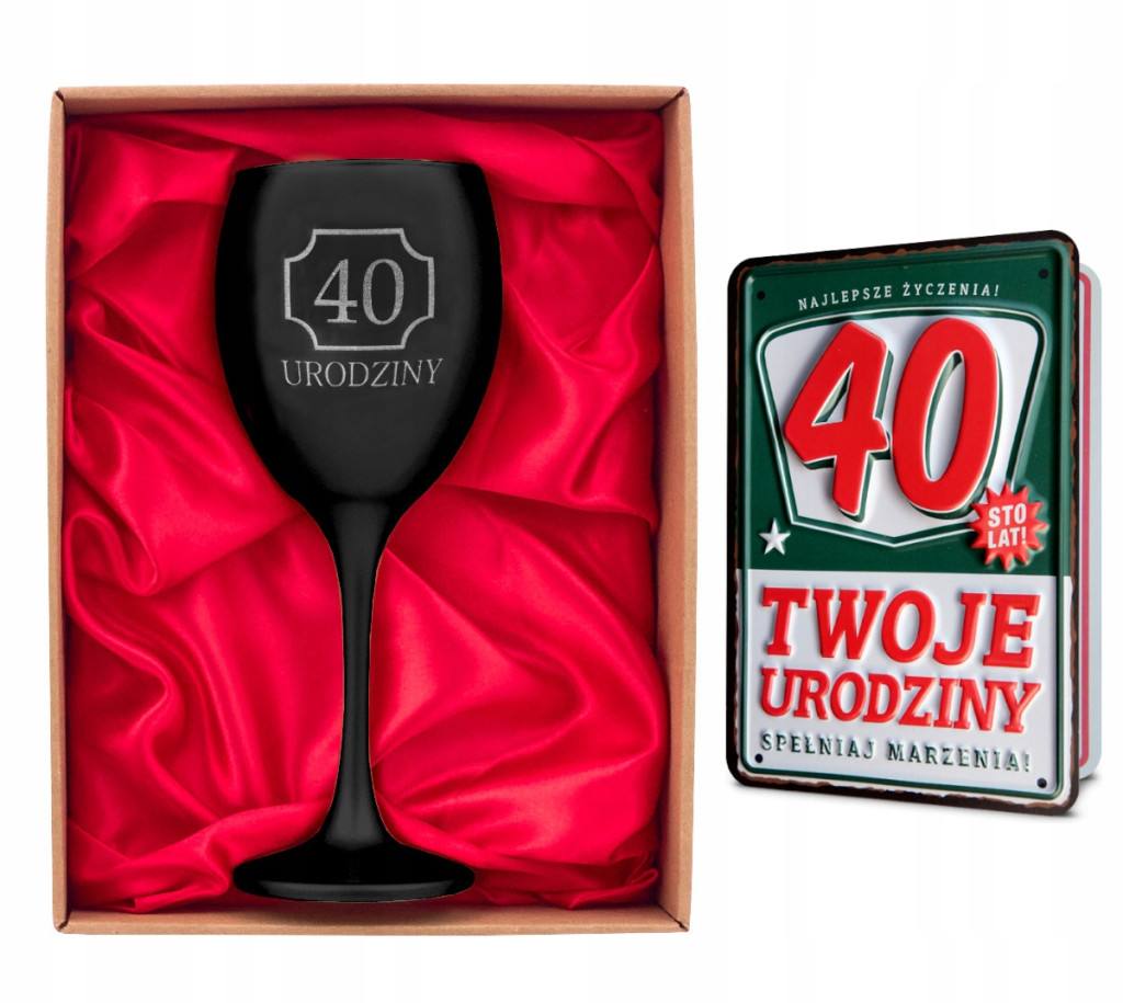 Elegancki kieliszek do wina w kolorze czarnym, udekorowany delikatnym grawerem „40 Urodziny”. Doskonały prezent na wyjątkową okazję. Zapakowany w kartonowe pudełko z wizjerem, wypełnione satyną w kolorze czerwonym. Idealny sposób na celebrowanie tego wyjątkowego momentu w życiu. Kartka jest bogato i różnorodnie zdobiona (lakier perłowy, elementy 3D - wypukłe wstawki papierowe, tłoczenia). Kartka zawiera życzenia i kolorowy środek.