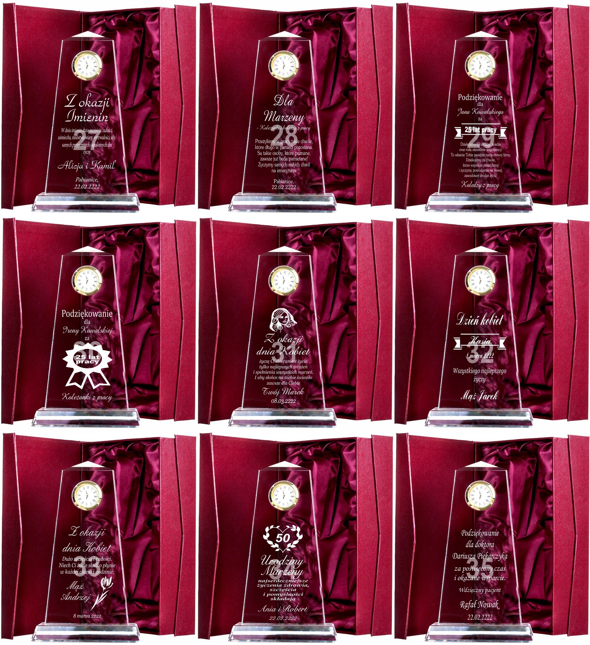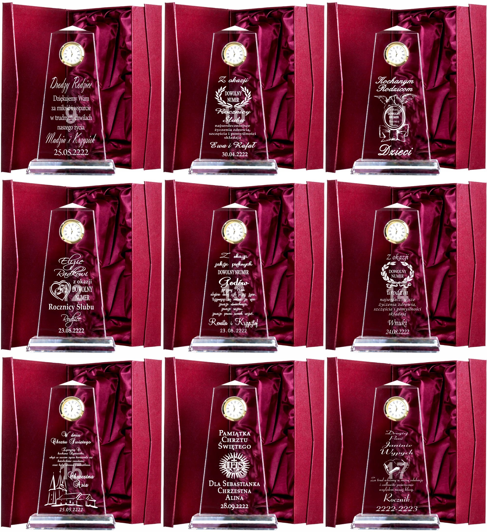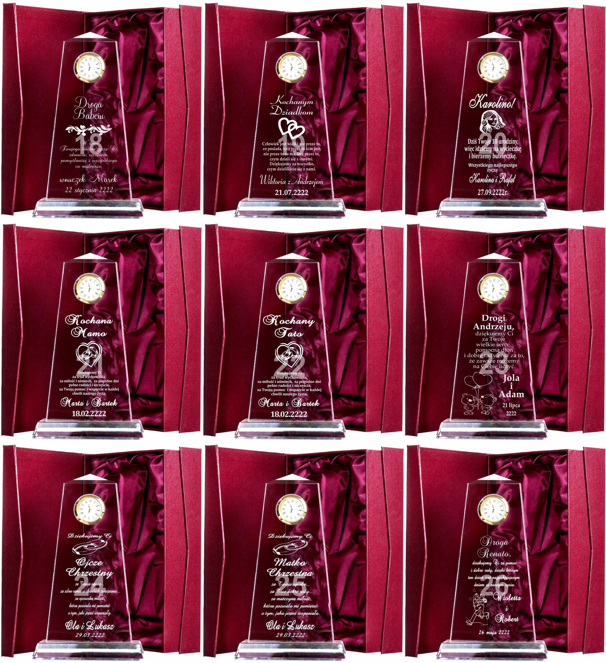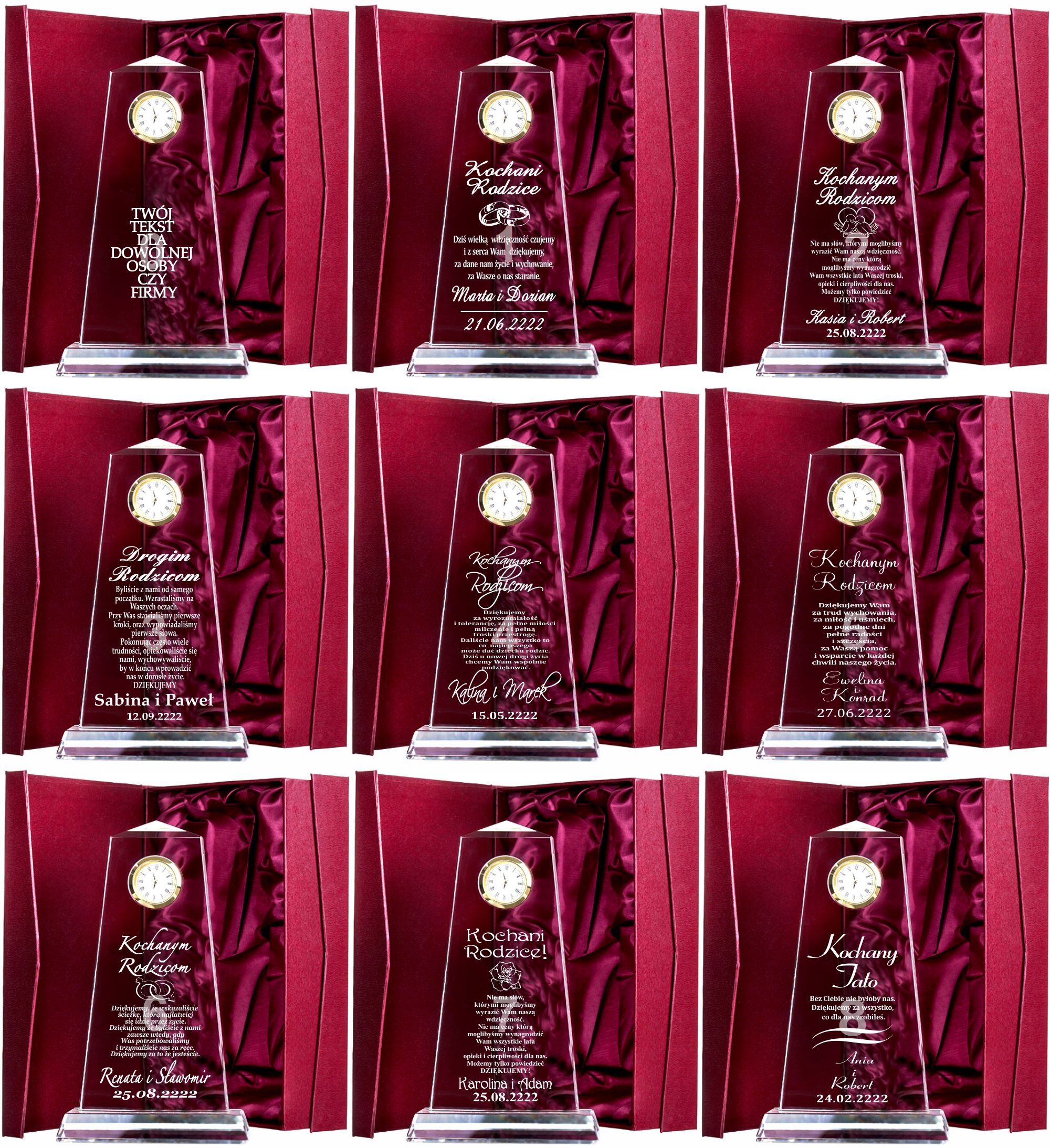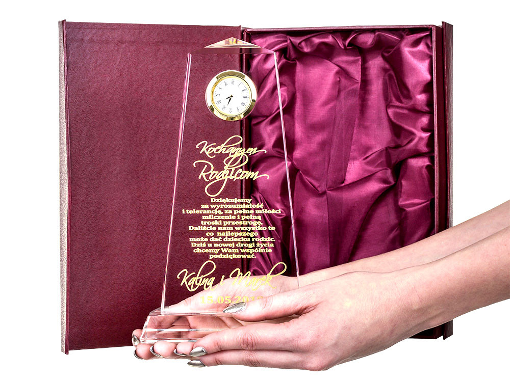Masz problem z podjęciem decyzji jaki prezent wybrać na podziękowania dla rodziców? Idziesz na rodzinną imprezę i nie wiesz co kupić jubilatowi / solenizantowi? Kup tą statuetkę z zegarkiem i etui! Jest duża, a kryształ z jakiego została wykonana ma prawie 2 cm grubości! Jest na prawdę ciężka, duża i bardzo solidnie wykonana. Zegar jest prawdziwy - to nie atrapa. Całość wygląda po prostu pięknie :)