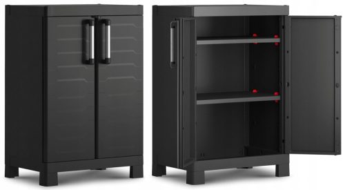 Do produkcji niskiej szafy Detroit wykorzystano najwyższej jakości tworzywo sztuczne, cechujące się dużą odpornością na uszkodzenia mechaniczne. Wewnątrz umieszczone zostały dwie półki o maksymalnym udźwigu do 15 kg, których wysokość można bez problemu dostosować do indywidualnych potrzeb. Niska szafa Detroit wyposażona została w ergonomiczne uchwyty, zapewniające komfortowe otwieranie i zamykanie drzwiczek oraz specjalne otwory umożliwiające zawieszenie kłódki. Solidna i wytrzymała konstrukcja oparta jest na regulowanych nóżkach, które podkreślają elegancki charakter mebla, a dodatkowo ułatwiają sprzątanie i utrzymanie idealnego porządku we wnętrzu. Stylowe wzornictwo oraz uniwersalna kolorystyka sprawiają, że niska szafa Detroit idealnie dopasuje się do każdej aranżacji.