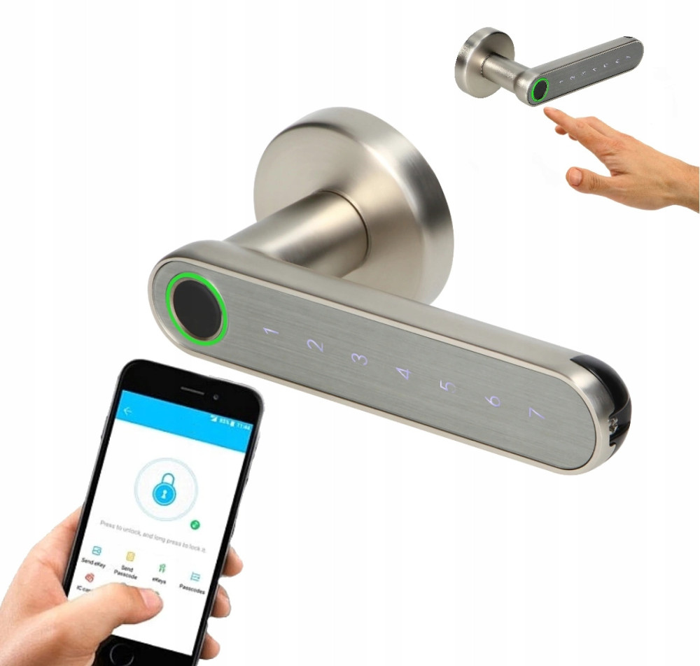 ✔️ Nowoczesna klamka szyfrowa z dotykową klawiaturą i czytnikiem linii papilarnych nadaje się do zastosowania zarówno w drzwiach prawych jak i lewych, w miejscu montażu tradycyjnej klamki.