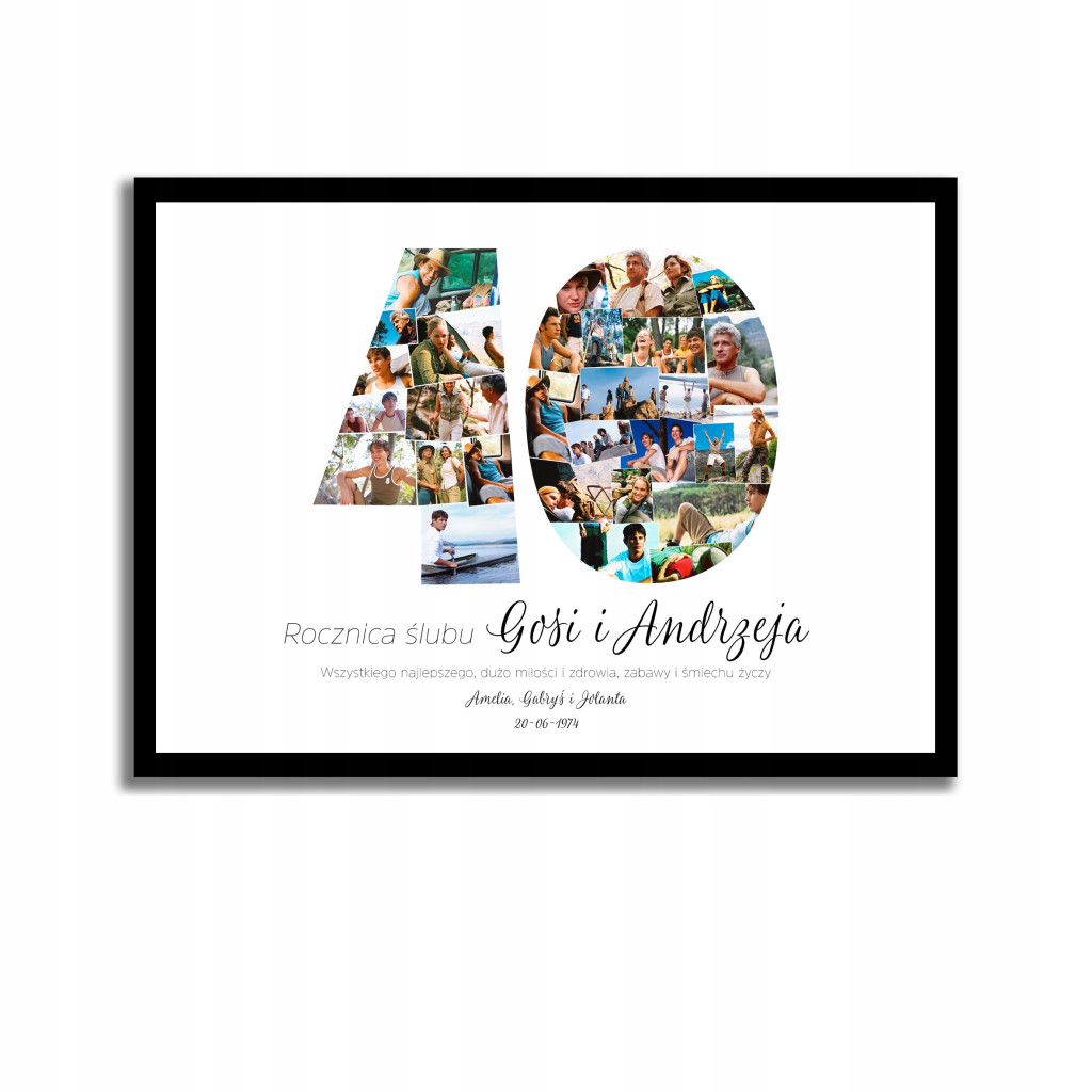 Piękny kolaż ze zdjęciami na 50 rocznicę ślubu. Zdjęcia bliskich, ważnych wydarzeń, z podróży, ze ślubu pięknie uchwycone w kolażu, pozwolą zapamiętać je na zawsze, pięknie ozdabiając ścianę domu.