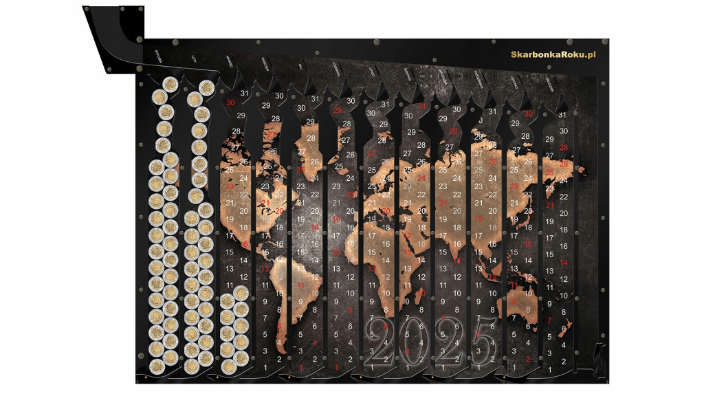 ➡️ Skarbonka w formie kalendarza Kalendarz 2025 Mapa Świata z cyferkami będzie nam przypominać kiedy wrzuciliśmy ostatnią monetę,