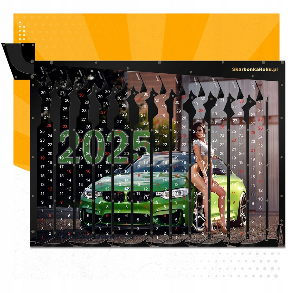 Kalendarz 2025 Kobieta z Autem to doskonały pomysł na prezent dla mężczyzny. Opcja kalendarza z super plakatem idealnie wpasuje się w męski pokój czy np. warsztat samochodowy. Będzie to na pewno super propozycja jako prezent dla dzień chłopaka czy dzień mężczyzny. Plakat samochodu będzie się pięknie prezentował w pokoju każdego mężczyzny, natomiast kalendarz zmotywuje do systematyczności i oszczędzania. Uniwersalny wzór będzie pasował wszędzie i sprawdzi się jako prezent dla każdego. Wzór kalendarza z cyferkami będzie pasował wszędzie i sprawdzi się jako prezent dla każdego. Istnieje możliwość dokupienia na naszej stronie samego plakatu kalendarza na następne lata, a wymiana tła jest bardzo prosta – wystarczy odkręcić kilka śrubek z tyłu.