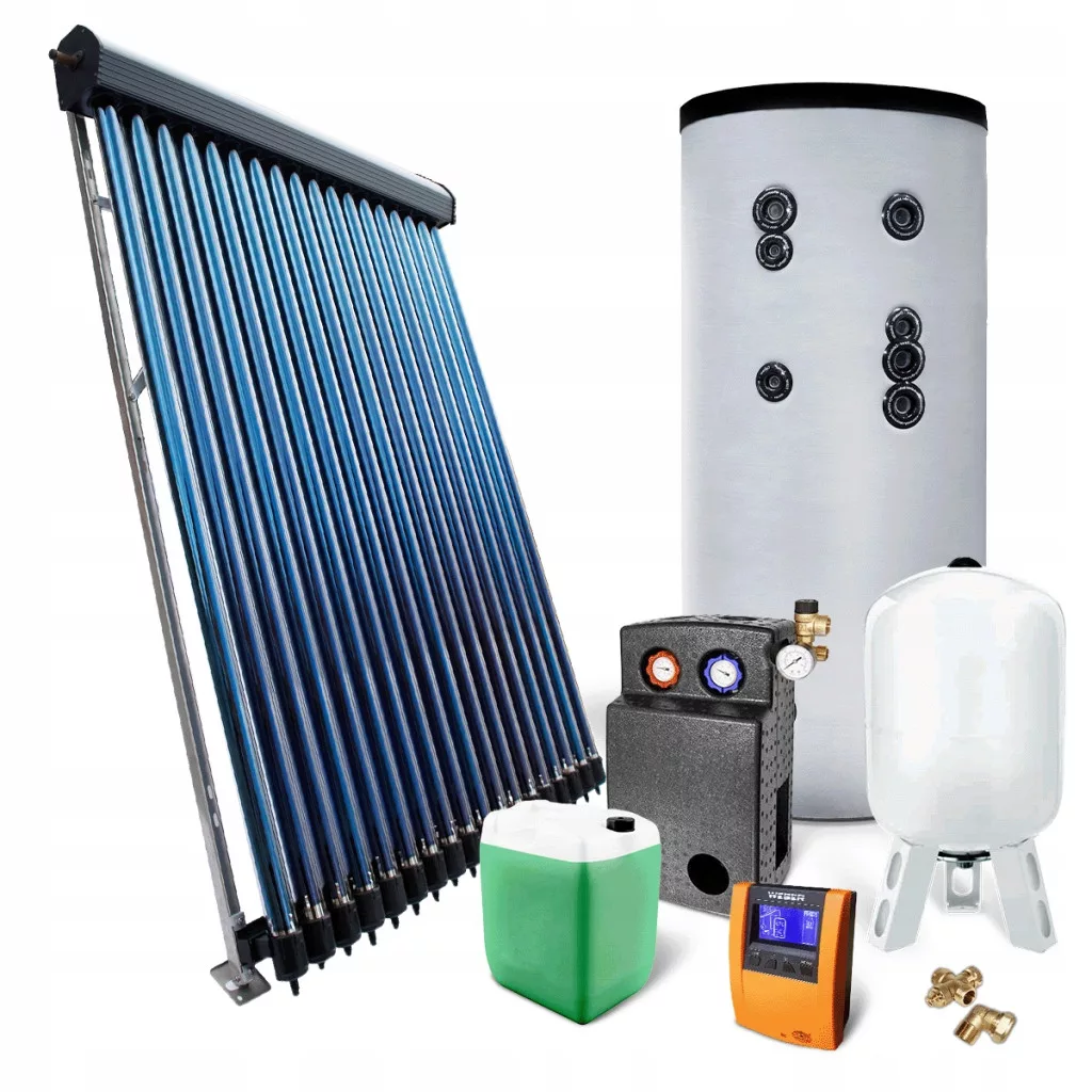 Wysokiej jakości zestaw solarny z zasobnikiem c.w.u. o pojemności 200 litrów oraz 1 kolektor słoneczny rurowo-prożniowy HP 30 w komplecie.
