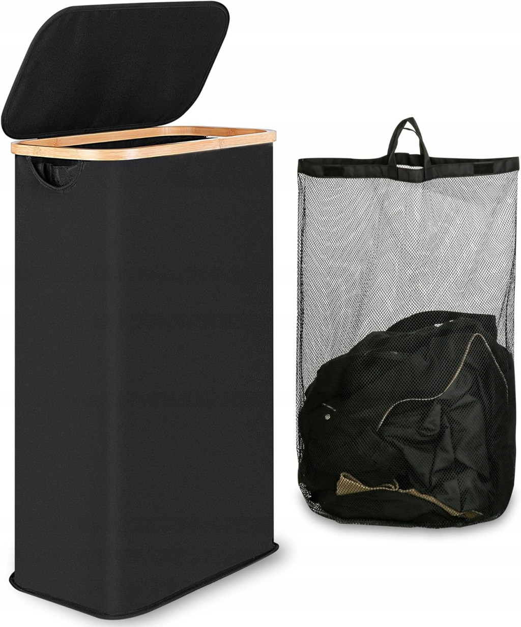 ① Kosz na pranie, kosz na pranie 60 l, z pokrywką i uchwytem, wąski, składany kosz na pranie ze zdejmowaną i nadającą się do prania torbą wewnętrzną, kosze na pranie do sypialni, łazienki, pralni (czarny)