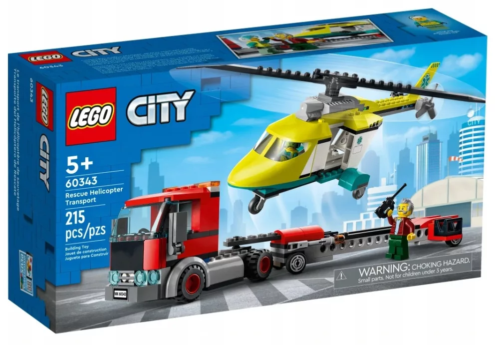 • Realistyczne szczegóły — ciężarówka ma długą, przegubową lawetę z płaską platformą i wysuwane lampy ostrzegawcze, a helikopter ratunkowy ma obracające się śmigła i schowek na dołączone do zestawu nosze