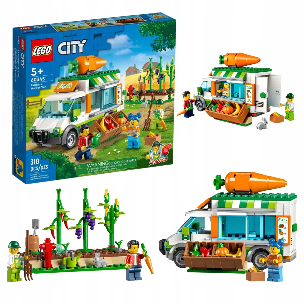 Hurra! Furgonetka na targu sprzedaje dziś pyszne, świeże warzywa. Pomóż farmerowi podlać i zebrać marchewki, kukurydzę, papryczki jalapeño i winogrona. Ustaw skrzynie ze smakołykami na wystawie, wejdź do sklepu na kółkach i podawaj klientom warzywa z przesuwanego okna. Dołącz do Horacego z serialu telewizyjnego LEGO® City i jego przyjaciół pracujących na wsi — tylko miej oko na tego głodnego królika!