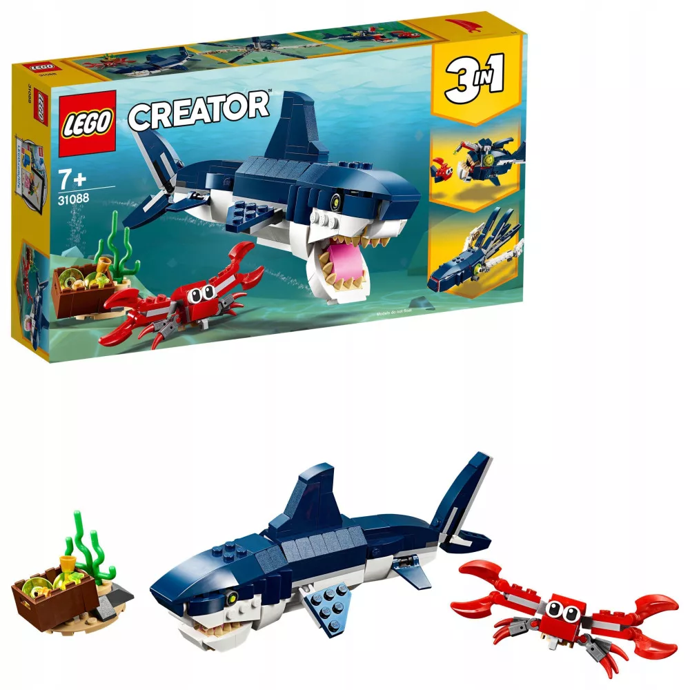 Zwiedź dno morskie w zestawie LEGO® Creator 3 w 1 31088 Morskie stworzenia. Znajdziesz w nim przerażającego, realistycznie wyglądającego rekina z granatowych i białych klocków. Ma on otwieraną paszczę pełną ostrych zębów, ruszające się płetwy, ruchome stawy i odblaskowe oczy. Do kompletu jest ruchomy krab pilnujący skrzyni ze skarbem. Zestaw LEGO Creator 3 w 1 umożliwia zbudowanie trzech różnych modeli do zabawy. Zbuduj rekina i kraba, a potem przebuduj na ruchomą kałamarnicę lub żabnicę z ogromną szczęką i przeżyj kolejne przygody w morskiej głębinie.