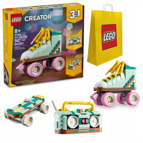 Lego Creator Wrotka w stylu retro 31148. Budując kolorowy zestaw LEGO® Creator Wrotka w stylu retro (31148) kreatywne dzieci w wieku od ośmiu lat mogą cofnąć czas. Zestaw zawiera wrotkę LEGO z czterema ruchomymi, różowymi kółkami, różowym hamulcem, grubymi żółtymi sznurówkami i zestawem kolorowych elementów do ozdobienia zapiętka.