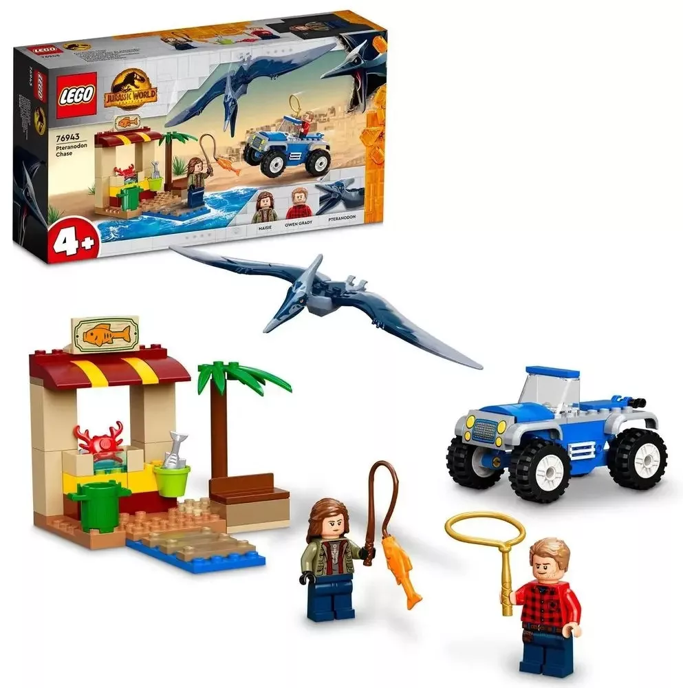 W tym niesamowitym zestawie inspirowanym filmem „Jurassic World Dominion” znajdziesz wszystko, czego potrzeba do ekscytującej zabawy. Zestaw zawiera dok, stragan z rybami i łazik do zbudowania z klocków, minifigurki Owena Grady’ego i Maisie z wędką i lassem, a także figurkę pteranodona. Czas ruszyć w pościg!