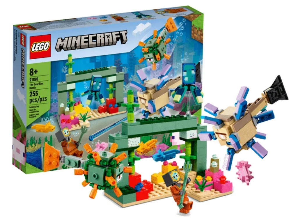 Zestaw LEGO® Minecraft Walka ze strażnikami (21180) zabiera ośmioletnich i starszych graczy na podwodną przygodę z mnóstwem znanych postaci i funkcji z przebojowej gry wideo.