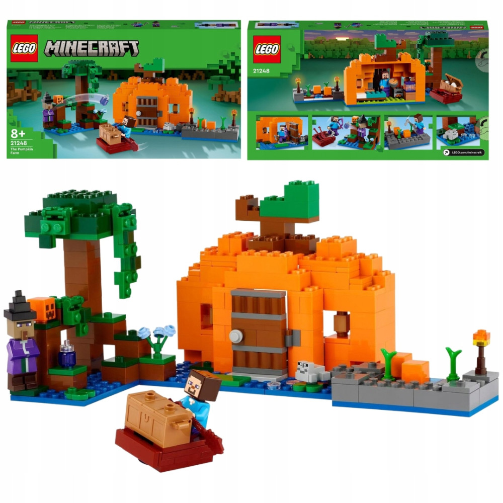 Dyniowa zabawa w stylu Minecrafta Ta pełna możliwości przebudowywania zabawka przedstawia słynny bagienny biom oraz głównego bohatera Steve’a na dyniowej farmie otaczającej dom w kształcie dyni. Dom ma umeblowane wnętrze, w którym jest łóżko, stół rzemieślniczy, piec i żabią lampę.