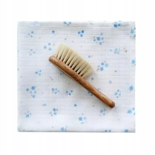Bardzo miękka i delikatna szczotka dla dzieci i niemowląt z naturalnego włosia koziego z drewnianą rączką w zestawie z praktyczną muślinową myjką.