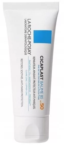 Kojący balsam regenerujący Cicaplast Baume B5 SPF50 La Roche-Posay zapewnia kompleksową pielęgnację podrażnionej skóry, pomaga odbudować jej barierę ochronną oraz zabezpiecza ją przed szkodliwym działaniem promieni UV. Może być stosowany na skórę świeżo wytatuowaną, a także po peelingach chemicznych i zabiegach kosmetycznych z użyciem lasera. Balsam przynosi ulgę podrażnionej skórze, zmniejszając zaczerwienienie, uczucie pieczenia oraz mrowienia.