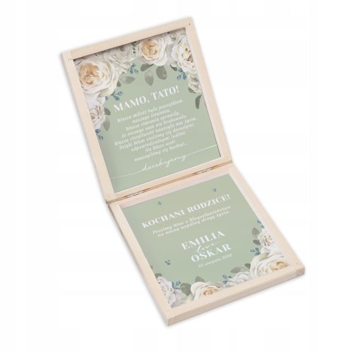 Pudełko wykonane jest z drewna. Dzięki temu prezentuje się wyjątkowo. W środku pudełka znajduje się tekst z prośbą o błogosławieństwo oraz podziękowanie za wsparcie, wychowanie oraz bezgraniczną miłość.