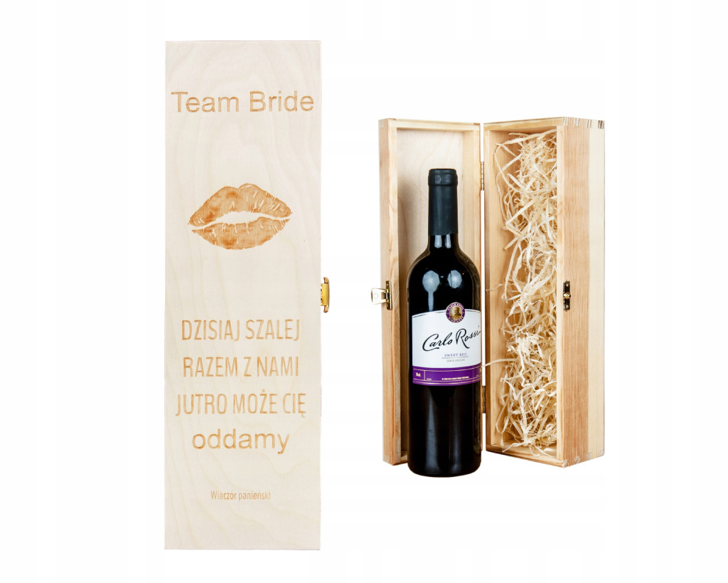 Skrzynka zamykana na alkohol w której możesz umieścić wino. Jest to elegancki prezent dla przyszłej panny młodej z okazji wieczoru panieńskiego. Produkt wykonany jest dokładnie i solidnie z drewnianej sklejki, oraz grawerowany według Twoich wytycznych.