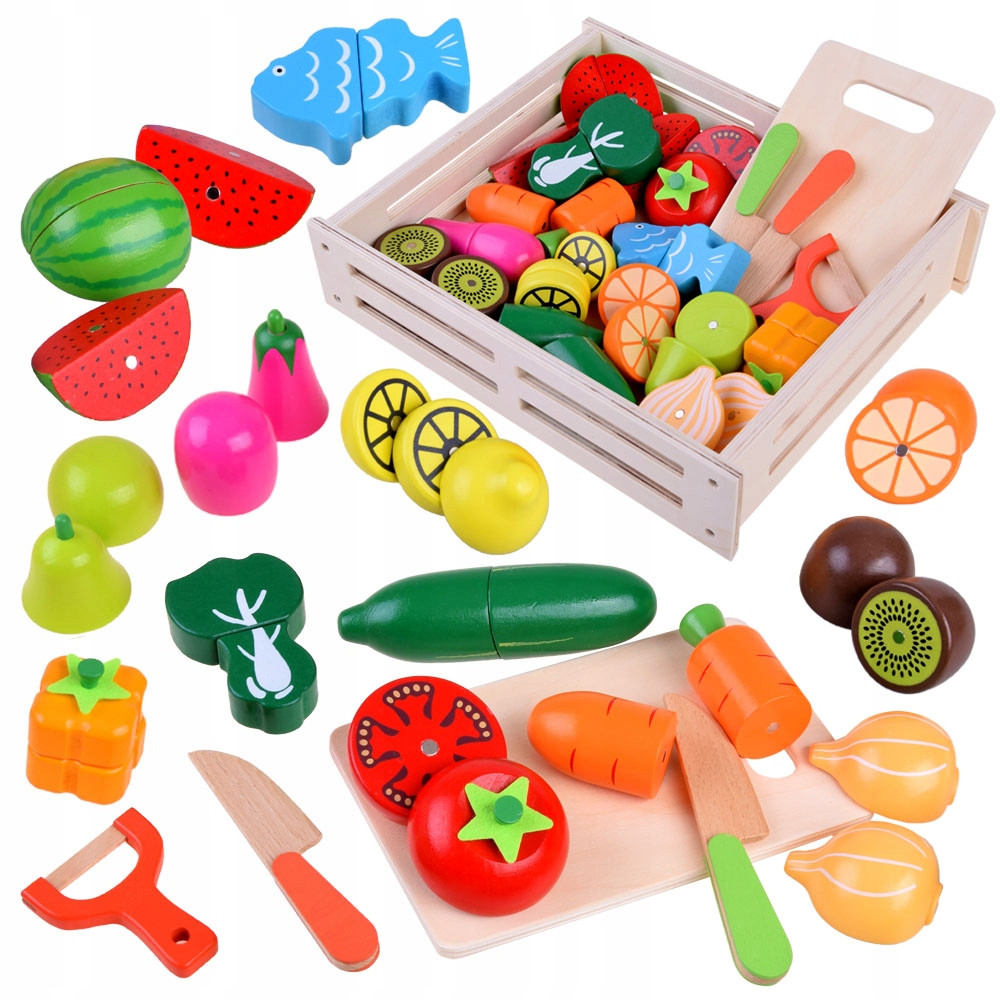 Drewniane warzywa i owoce do krojenia w naturalnej skrzynce z deską do krojenia i bezpiecznymi nożami. Zestaw naturalnie odwzorowanych warzyw, owoców i ryby zapewni kulinarne rewolucje. Dzieci uwielbiają naśladować dorosłych i ich czynności codzienne, taki zestaw sprosta takim wyzwaniom.
