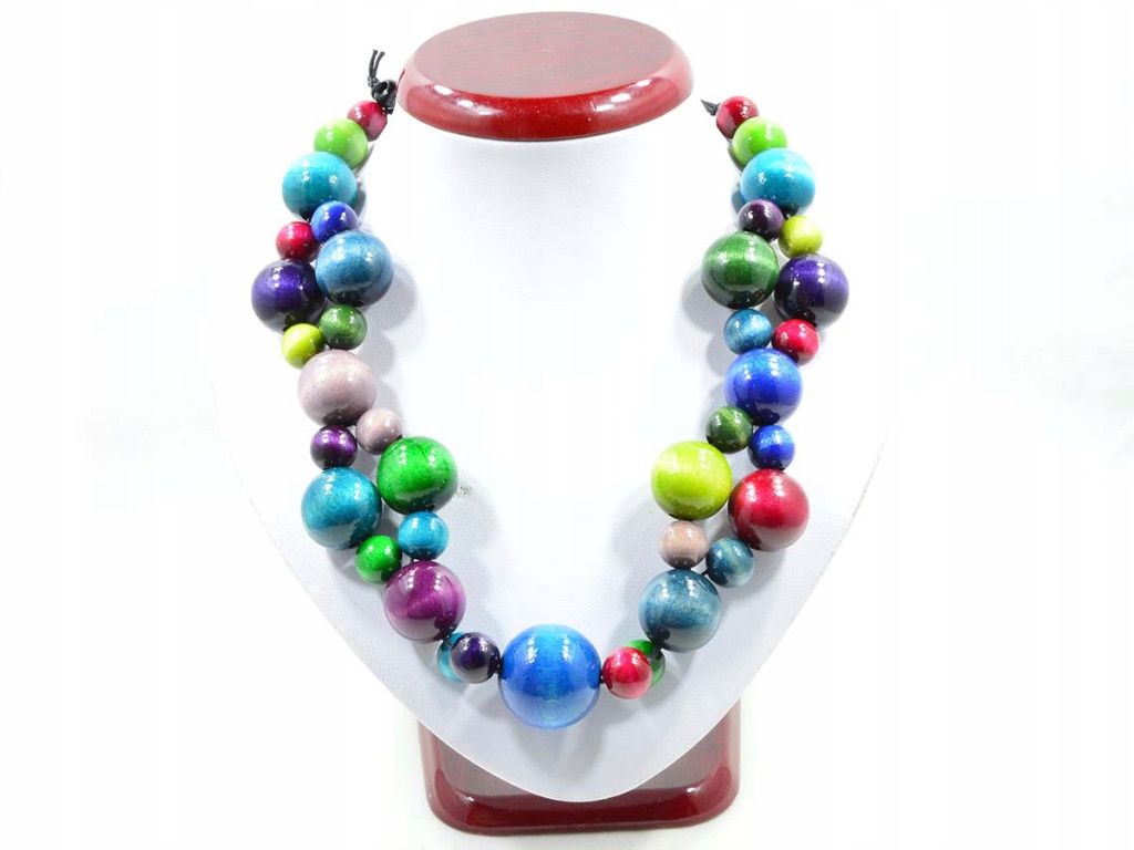 Okazały naszyjnik upleciony na sznurku bawełnianym zawoskowanym w zwartą, spójną całość z koralików drewnianych wielkości od 12-20mm. Polskie bukowe drewno w żywych nasyconych barwach, bardzo błyszczące.