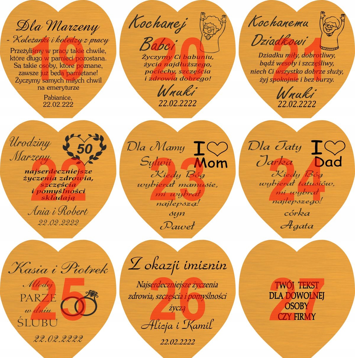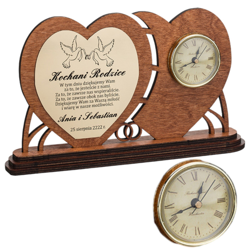 Masz problem z podjęciem decyzji jaki prezent wybrać na podziękowania dla rodziców albo rocznicę ślubu? Idziesz na rodzinną imprezę i nie wiesz co kupić jubilatowi / solenizantowi? Kup teraz tą statuetkę. Statuetka jest w kształcie dwóch serc z grawerem bezpośrednim na specjalnym laminacie grawerskim. Jest to nasz oryginalny pomysł na prezent dla Rodziców czy na każdą inną okazję. Nie oszczędzamy na materiale, gdyż statuetka ma wymiary 300x175 mm, a podstawa ma szerokość 60 mm i mierzy 18 mm grubości. Została wykonana z DROGIEJ SKLEJKI O 6 MM GRUBOŚCI - bardzo dobrze prezentuje się na półce czy biurku - nie ginie w tle gdyż jest po prostu duża. Dodatkowo bejcowana i lakierowana. Z lewej strony ma prawdziwy zegarek (to nie atrapa) Obdarowana osoba widząc tak dobrze wykonany prezent na pewno będzie zachwycona!