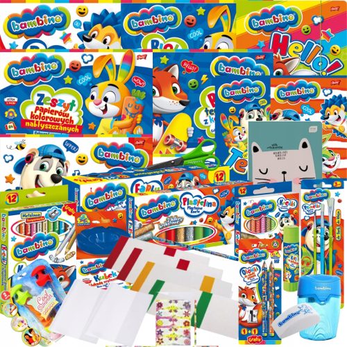 Kompletna wyprawka skomponowana głównie z wysokiej jakości produktów Bambino. Zestaw uzupełniony jest o elementy innych marek gwarantujących równie wysoką jakość. Zawiera produkty niezbędne do rozpoczęcia szkolnej przygody.